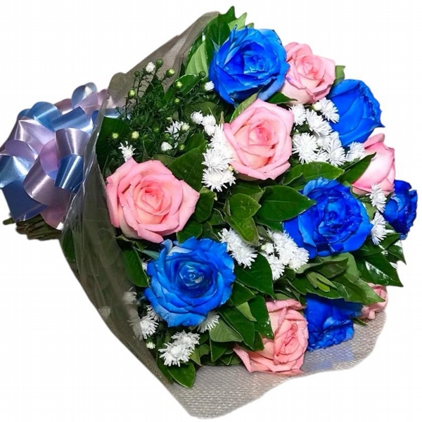 06 rosas azuis e 06 rosas cor de rosa, acompanha folhagem verde e detalhes em gypsofila