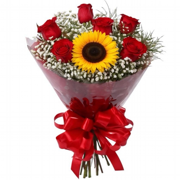 Um buquê apaixonante que traz um girasssol radiante no centro, simbolizando luz, alegria e boas energias, envolvido por 6 rosas vermelhas que representam amor verdadeiro.