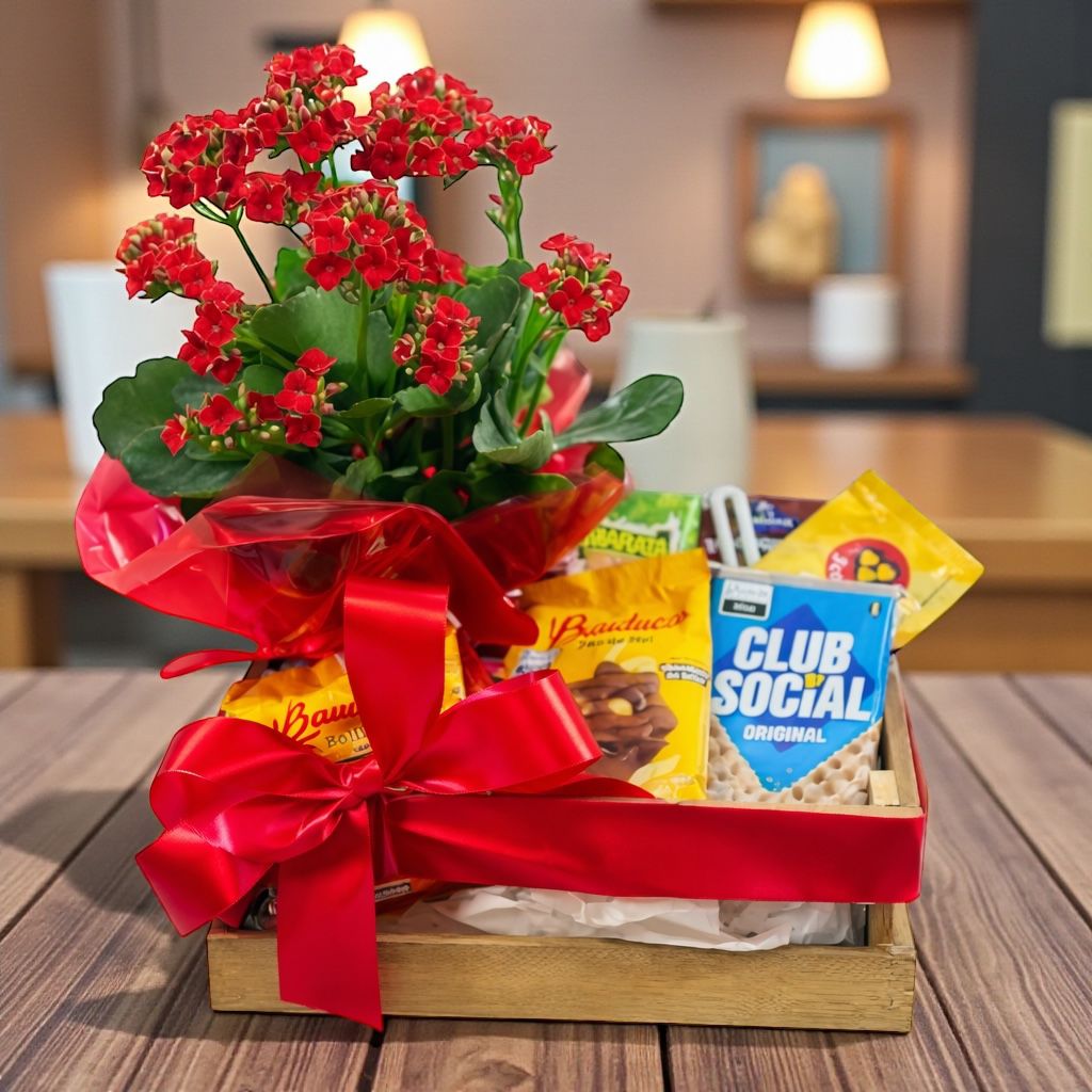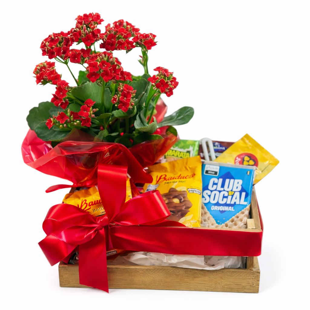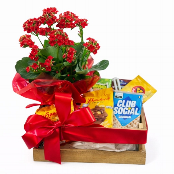 Esta cesta reúne um kalanchoe colorido, símbolo de alegria e durabilidade, acompanhado por uma seleção especial de itens para um momento delicioso e aconchegante.
