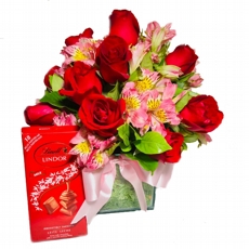 Arranjo de Rosas Vermelhas Alstromelias e Lindt